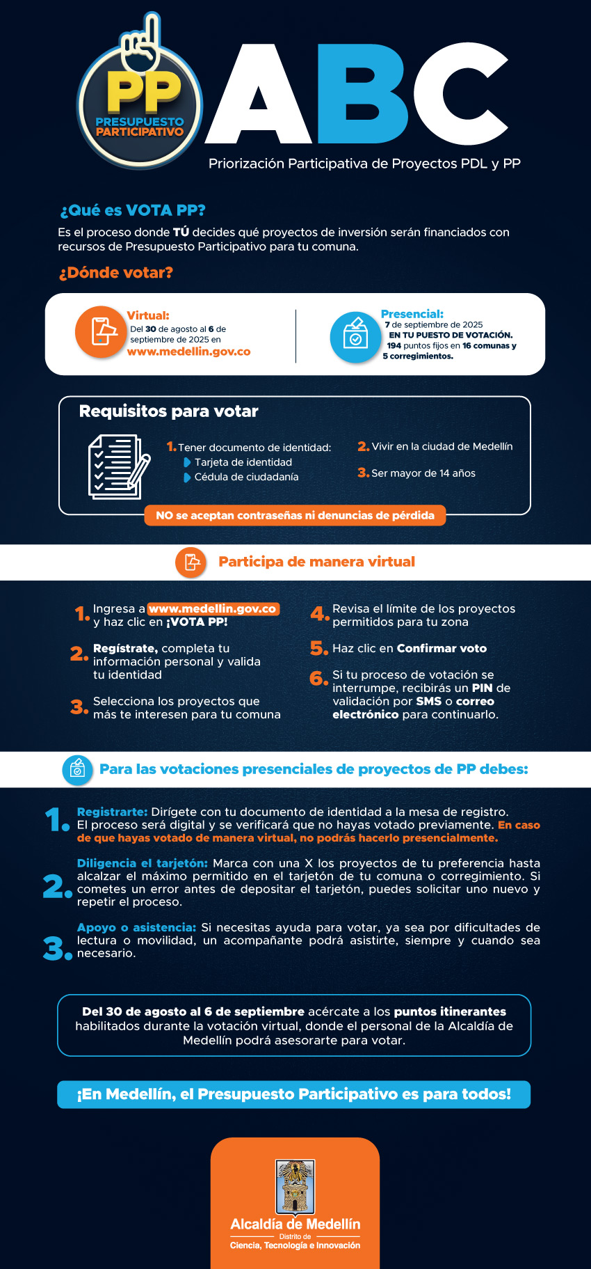 Del 30 de agosto al 6 de septiembre de 2025 en www.medellin.gov.co y haz clic en ¡VOTA PP!